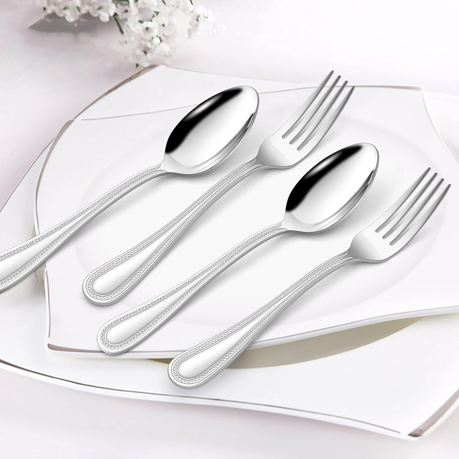 Upgrade your dining experience with the HaWare 60-Piece Pearled Edge Stainless Steel Flatware Set and add a touch of sophistication to your table setting. Perfect for home use or as a thoughtful gift for weddings, housewarmings, or special occasions.
